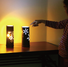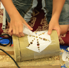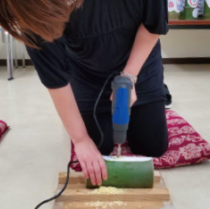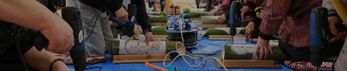 竹灯篭づくりは、電動ドリルを安全に使いながら、こどもからご年配の方まで簡単に楽しく作れます。お好きな絵柄を竹に貼り付けて、穴を開け明かりを灯すと、見ているだけで心が落ち着くような竹灯籠が出来上がります。参加するみなさんは、無心で穴を開けて参加されています。