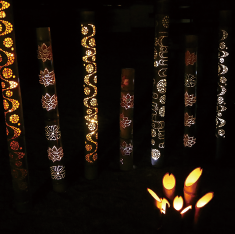 | <注意事項> | ◎作成した竹灯籠はお持ち帰りいただけます。※未完成の竹のみの持ち帰り、デザイン画の持ち帰りはご遠慮願います。 ◎竹灯籠は、自然のものを材料としておりますので、竹の割れやヒビなど、品質の状態が変わる場合がございますので、予めご了承下さい。 ◎簡単なアンケートのご記入にご協力をお願い致します。 |